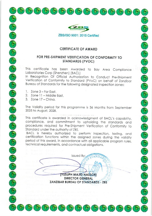 作為國際權威第三方檢測認證機構,BACL已于2025年9月正式獲得ZBS官方授權,成為中國(含港澳臺)、日本、韓國、朝鮮、蒙古、中東及東南亞地區出口至桑給巴爾的所有普通商品的PVoC CoC發(fā)證機構,可高效幫助廣大廠(chǎng)商順利進(jìn)軍桑給巴爾乃至整個(gè)東非市場(chǎng)!