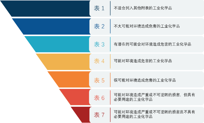 IChEMS登記冊根據化學(xué)物質(zhì)的風(fēng)險特征將其分配到七個(gè)附表之一。附表6和附表7中的化學(xué)物質(zhì)對環(huán)境影響最為關(guān)注,并且受到更嚴格的控制,一旦物質(zhì)被列入IChEMS登記冊附錄6或附錄7中,意味著(zhù)澳大利亞將禁止這些物質(zhì)的進(jìn)口、制造、使用和出口。