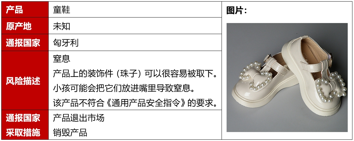 2024年4月,歐盟、美國、加拿大和澳洲共發(fā)生1例鞋類(lèi)召回案例。該召回發(fā)生在歐盟,且是因為存在窒息風(fēng)險被召回的。