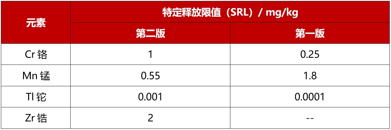 1. 修訂了鉻 (Cr)、錳 (Mn)和鉈 (Tl)三項特定元素釋放限值,新增鋯 (Zr)的要求: