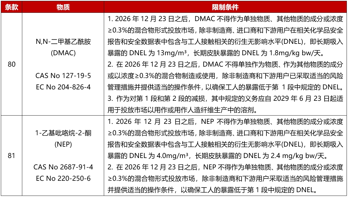 [導讀]: 2025年6月3日,歐盟在其官方公報上發(fā)布法規(EU) 2025/1090,在歐盟REACH法規(EC) No 1907/2006附錄XVII中增加第80條和第81條,分別限制投放歐盟市場(chǎng)的物質(zhì)和混合物中的N,N-二甲基乙酰胺(DMAC,CAS號:127-19-5)和1-乙基-2-吡咯烷酮(NEP,...