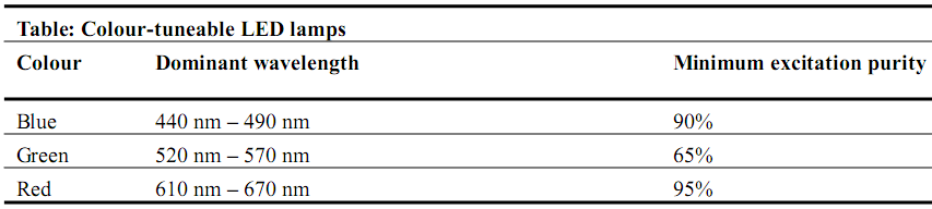e)colour-tunable LED lamps全彩可調的LED燈,不包含用于光轉換的熒光粉材料的LED燈,可以發(fā)出紅綠藍三種顏色,且色純度滿(mǎn)足下面表格要求: