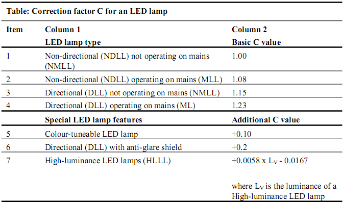 其中 η是光效閾值,為120 lm/W。L是終端損耗因子,對于connected LED lamp為 2.0 W,其他類(lèi)型的燈為1.5 W。F是光效因子,對于使用總光通量的非定向LED燈(NDLL),為1.00;對于使用90°或120°錐體中的光通量的定向LED燈(DLL),為0.85;對于使用前向流明測量值(對應于180°錐體),光束角為0