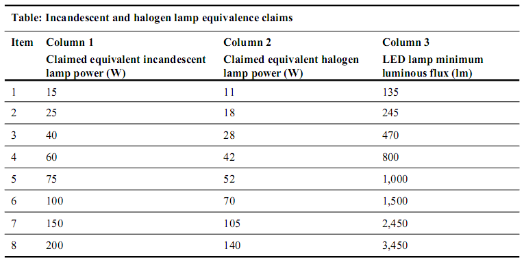 等效非定向白熾燈或鹵素燈的標稱(chēng)功率所對應的最小光通量