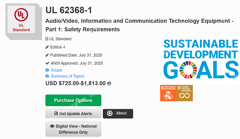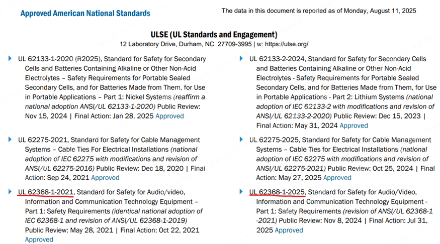 繼國際標準IEC 62368-1:2023(第四版)與歐盟標準EN IEC 62368-1:2024(第四版)相繼發(fā)布后,美國標準UL 62368-1:2025(第四版)于2025年7月31日正式發(fā)布,并于當日被美國國家標準學(xué)會(huì )(ANSI)采納為美國國家標準。