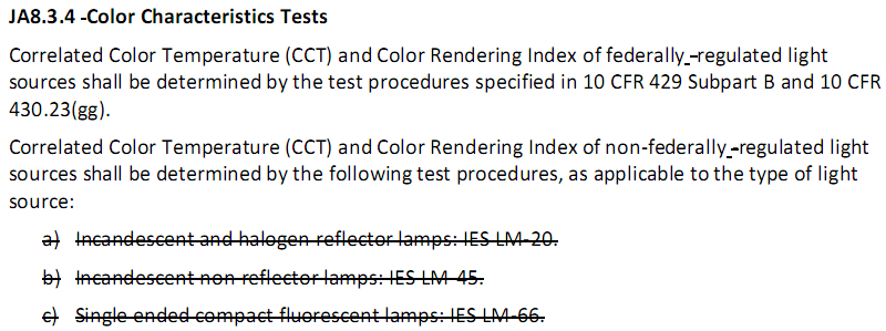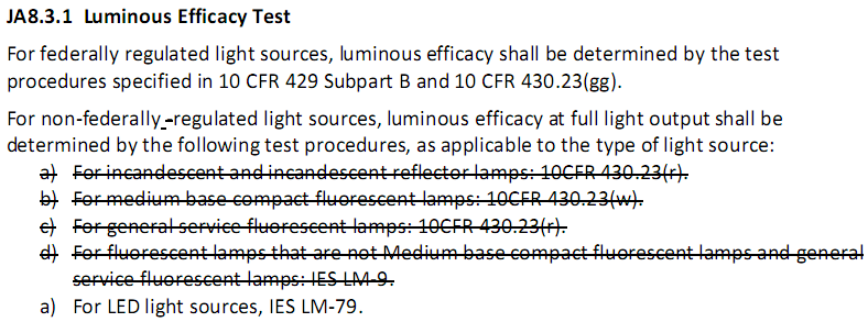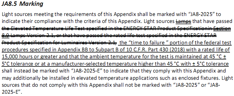 更新五:標識Marking更新為JA8-2025或者JA8-2025-E,同時(shí)光源采用DOE 中Appendix BB to Subpart B of 10 C.F.R. Part 430的壽命老化方法,只有老化環(huán)境溫度為45°C±5°C或者制造商選擇更高的老化溫度才能打JA8-2025-E的標識