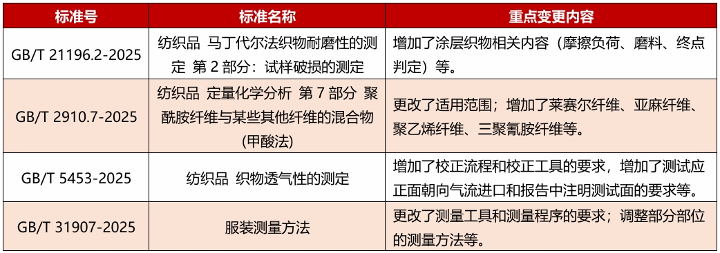 2025年,中華人民共和國工業(yè)和信息化部、國家市場(chǎng)監督管理總局(國家標準化管理委員會(huì ))發(fā)布了一批紡織品、服裝及相關(guān)產(chǎn)品的檢測方法與執行標準的新版本。新版本2027年開(kāi)始實(shí)施,在實(shí)施日期前的兩年多過(guò)渡期內,新舊版標準可并行使用。主要內容匯總如下: