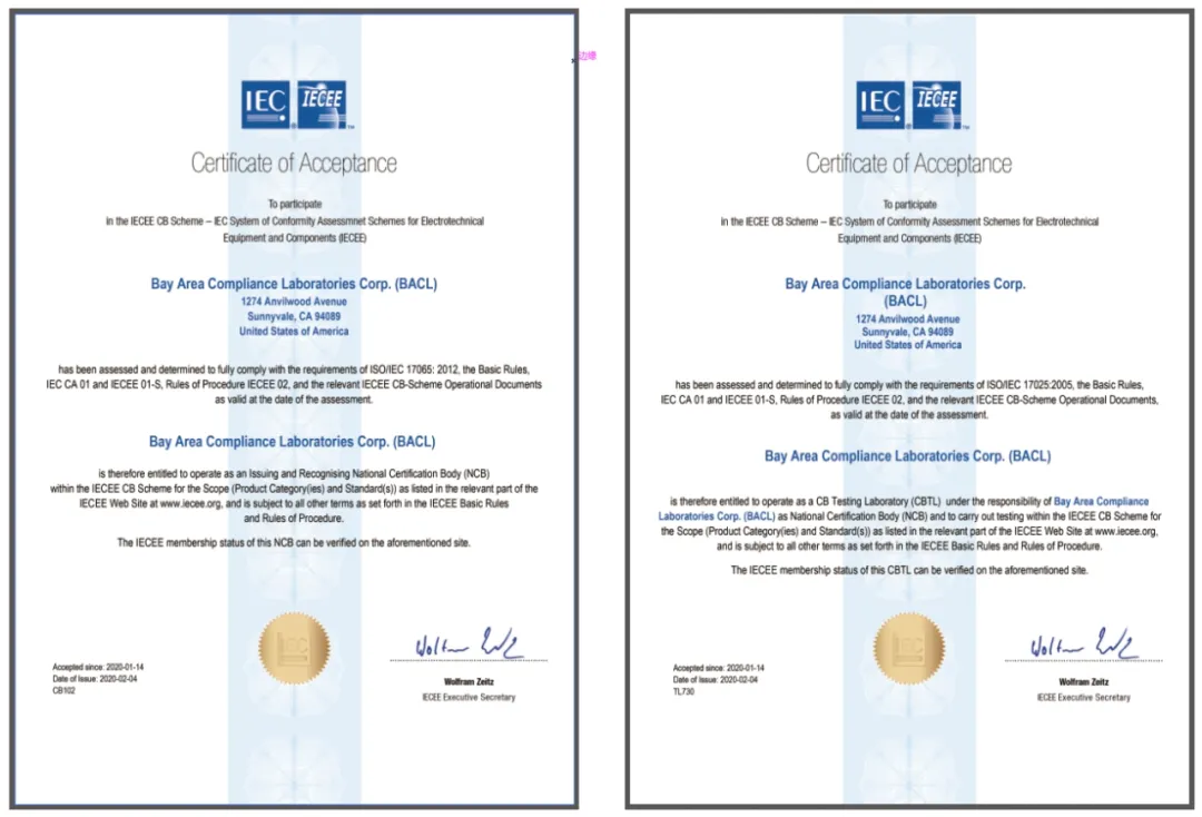 BACL是美國OSHA和加拿大SCC雙認可的北美安規認證機構,歐盟CE認證的通告機構(Notified Body: 1313),IECEE CB Scheme的認證機構NCB和測試實(shí)驗室CBTL(CB102, TL730);同時(shí)還獲得A2LA, IAS, CNAS, CMA, FDA, ACMA, SAA等場(chǎng)地授權和認可,分別在美國、韓國、中國臺灣、深圳福田和南山、東莞、成都、昆山等地設有安規測試實(shí)驗室,可為您提供IT/AV, HOUS、照明產(chǎn)品、電源產(chǎn)品、電動(dòng)工具等產(chǎn)品的全球認證包括:美國(NRTL, FCC, ENERGY STAR, FDA, DOE, CEC), 加拿大(SCC, ISED, NRCan),歐盟(CE), 韓國(KC), 歐盟CE NB, 國際電工委員會(huì )IECEE CB Scheme, 日本(MIC), 新加坡(IMDA), 中國香港(OFCA),中國臺灣(NCC, BSMI), 埃及(NTRA, GOEIC), 越南(MIC), 沙特(SASO), 菲律賓(NTC),泰國(NBTC), 馬來(lái)西亞(SIRIM), 印度(BIS, WPC, TEC)等多國家及地區的認證服務(wù),保障您的產(chǎn)品在國際貿易壁壘日趨激烈的今天,依然順利的進(jìn)入國際貿易市場(chǎng)!